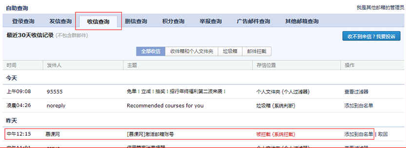 QQ邮箱拦截邮件的查找:(其他邮箱都有类似设置,把慕课网添加到白名单即可)