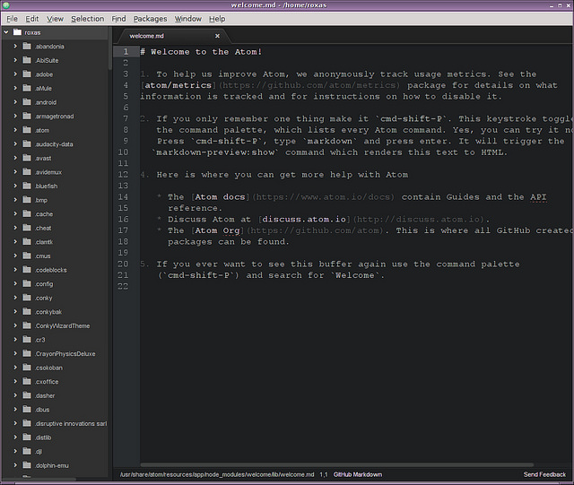 距现在更近的,GitHub以开源形式发布了Atom,展开了与Sublime Text正式的竞争。Atom打包了所有你想要的文件跳转,代码片段使用等特性,提供一个完整特性的编辑器而不是简单的编辑框。使用HTML,CSS和集成Node.js环境,可以轻易地定制文本处理过程,这正是它的魅力所在。这其实已经要涉及到IDE的定义了,我们的列表最多会覆盖到这里。(LCTT译注:好吧,我觉得从Sublime Text转移出来的最佳出口就是Atom。)