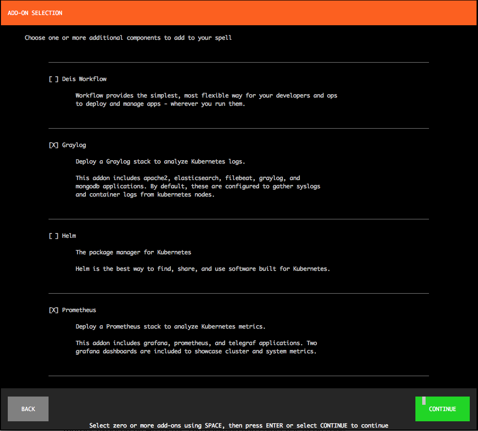 这个时候,你将看到 CDK spell 可用的附加组件。我们感兴趣的是 Graylog 和 Prometheus,因此选择这两个,然后点击 “Continue”。