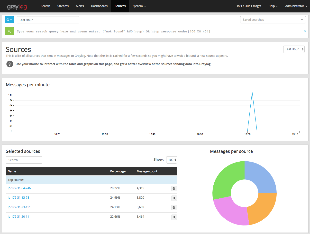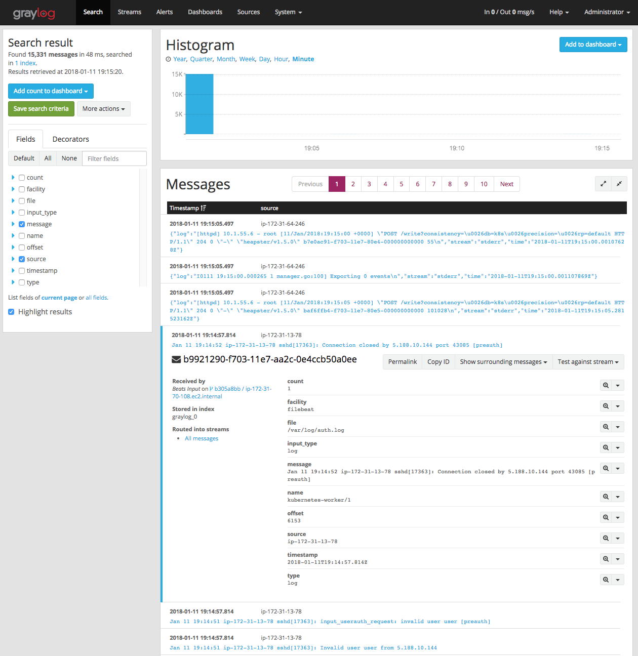 现在,Graylog 已经部署和配置完成,我们可以看一下采集到的一些数据。默认情况下,filebeat 应用程序将从 Kubernetes 的 master 和 worker 中转发系统日志( /var/log/*.log )和容器日志(/var/log/containers/*.log)到 graylog 中。