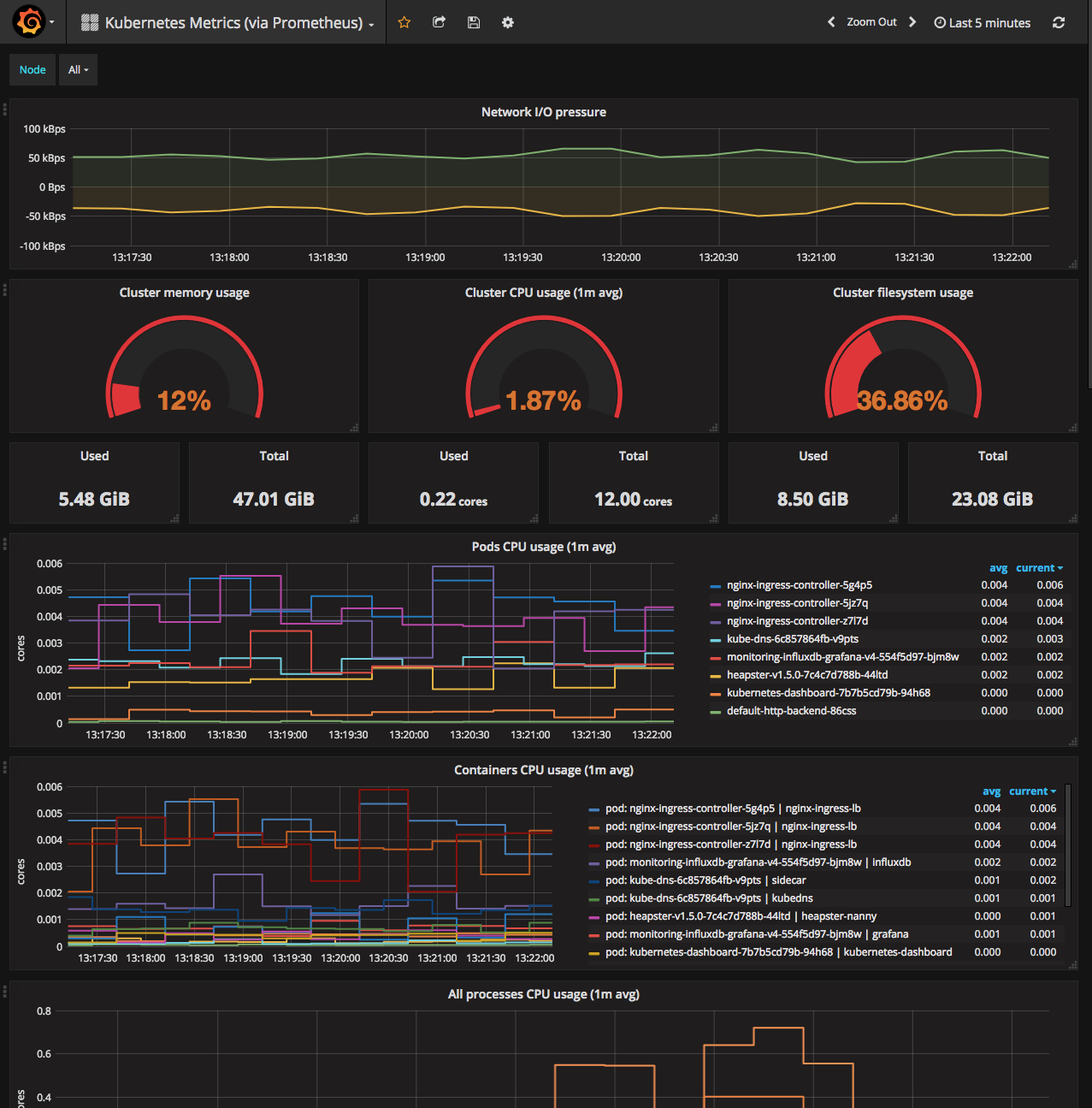 我们的部署通过 grafana 仪表板提供了两种类型的指标:系统指标,包括像 K8s master 和 worker 的 CPU /内存/磁盘使用情况,以及集群指标,包括像从 K8s cAdvisor 端点上收集的容器级指标。