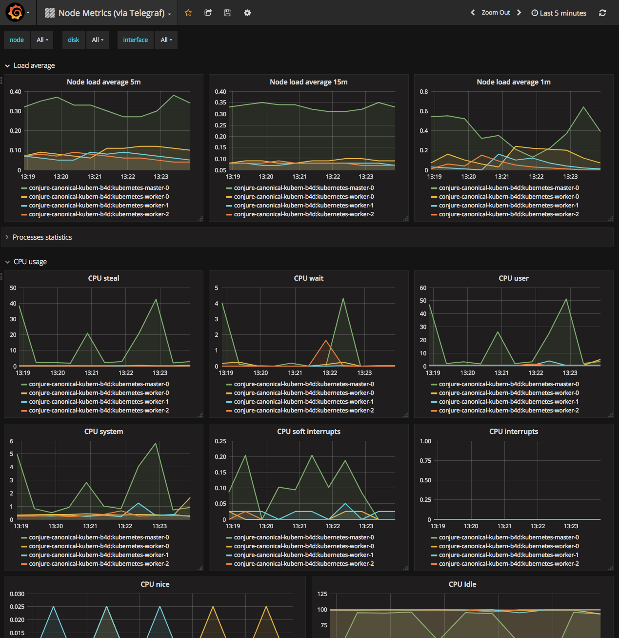 ## relate prometheus applications juju relate prometheus:grafana-source grafana:grafana-source juju relate telegraf:prometheus-client prometheus:target juju relate kubernetes-master:juju-info telegraf:juju-info juju relate kubernetes-worker:juju-info telegraf:juju-info