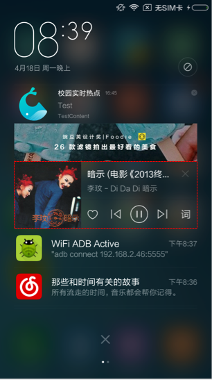 另外需要注意的是很多手机的Rom可能不会对以上的style做修改,而是采用自己的样式,这样就比较蛋疼。借鉴网易云音乐的方法,在api 21以下,因为大部分手机都使用黑色背景,所以采用透明背景,文字颜色跟随系统。而在api大于等于21时,因为原生Android采用了白色的通知背景,而很多手机厂商的Rom的通知仍然为黑色背景,因此为了通用,采用一个固定的黑色背景,文字颜色同样跟随系统。在这基础上,对某部分特定手机Rom做适配,如华为等在api 21以下通知背景也为白色。这应该是比较完美的做法,但是需要花费较多的时间,所以如果为了简单起见,还是采用方案一吧。