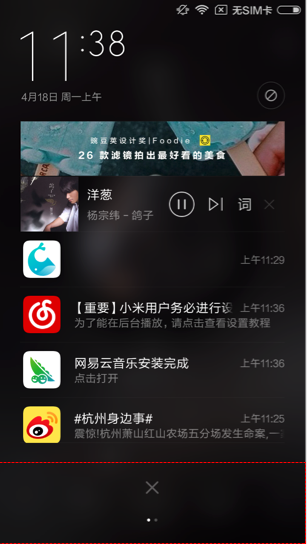 为了理解以上代码,我们需要明确一个我们很容易忽略的问题,那就是通知是可以展开和收起的。请看以下两张图片。同样是网易云音乐的通知,图一比图二要大一些。其实图一展示的是网易云音乐通知的展开状态,使用两个手指上滑就可以缩起,也就是图二。