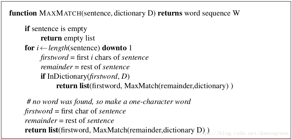 今天阅读的时候,发现了一个分割句子中词语的算法:MaxMatch,这个算法在中文应用中效果很好。