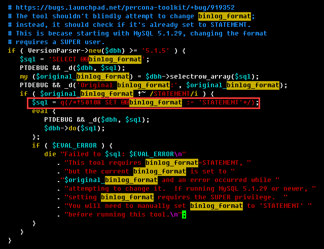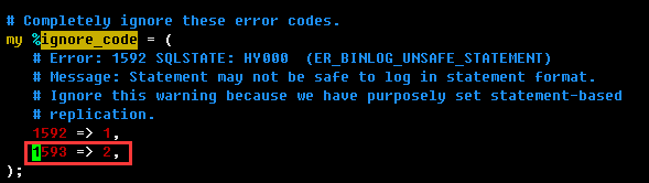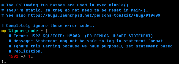 4、从源码中看到pt-table-checksum对1592的code做了忽略,当出现1592的warnings时会继续下面的处理,而当编号变为1593时,pt-table-checksum工具在这里就直接报Error了