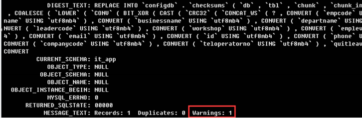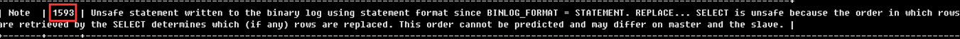 关键的差异在于warning的code编号发生了变化,在MySQL5.6及原生MySQL5.7下是1592,在我们改造过的MySQL5.7.23下是1593