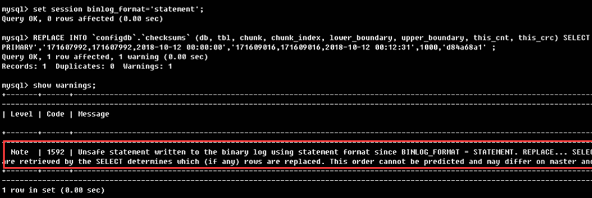 对于Unsafe statement written to the binary log using statement format since BINLOG_FORMAT = STATEMENT. REPLACE... SELECT is unsafe because the order in which rows are retrieved by the SELECT determines which (if any) rows are replaced. This order cannot be predicted and may differ on master and the slave.的报错,其实是warning信息