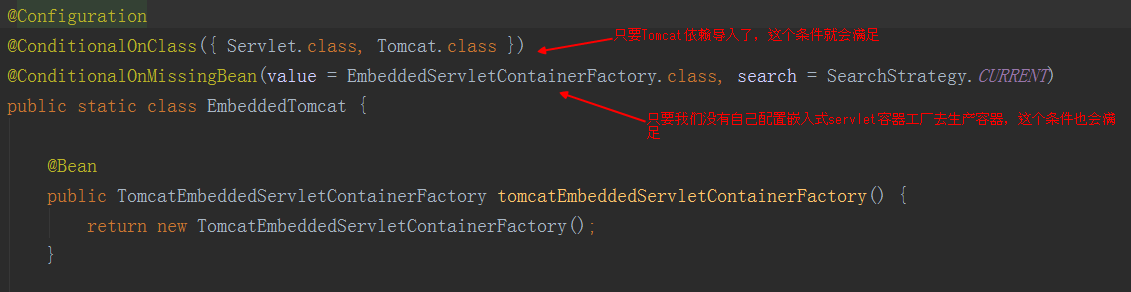 只要添加了tomcat的依赖,会为ioc容器里面添加Tomcat的嵌入式servlet容器工厂,打开这个容器工厂