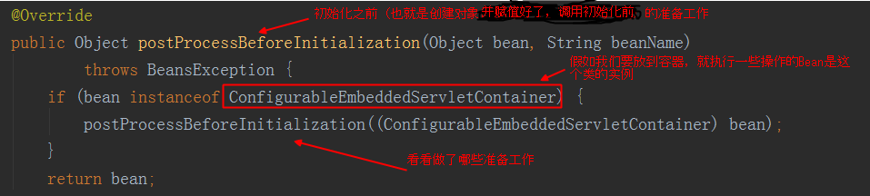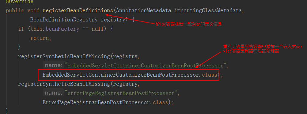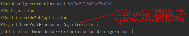 是不是还忘记了前面说的,这个自动配置类要起作用,会提前在ioc容器中导入一个注册器,这个组件很关键,他会在EmbeddedServletContainerAutoConfiguration自动配置类之前先给容器中注册一些后置处理器,在ioc容器中满足条件的Bean创建对象并且赋值好了,调用初始化方法之前,会做一些准备工作,下面我们打开这个注册器BeanPostProcessorsRegistrar,看看注册了哪些后置处理器(BeanPostProcessors),打开这个来,看这里