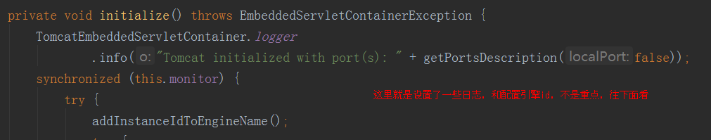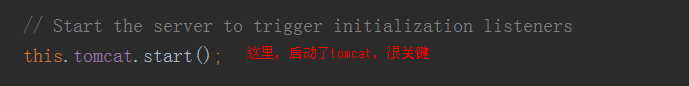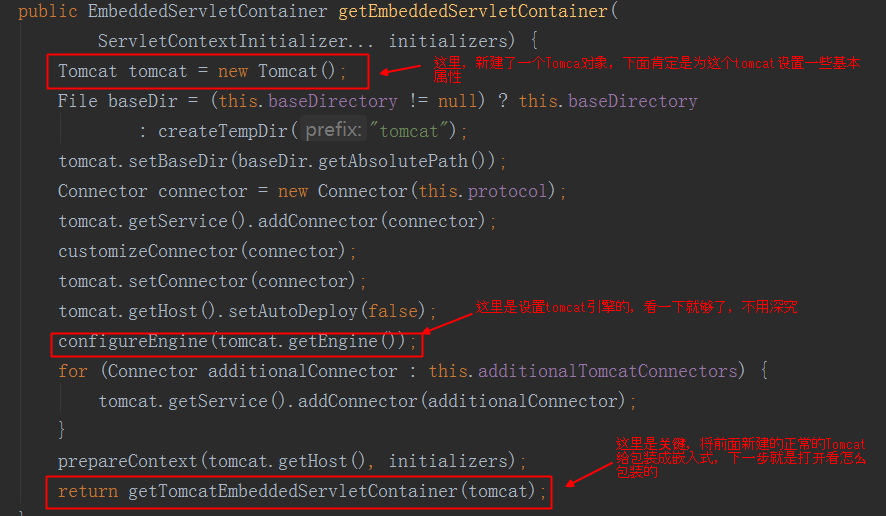 一直到这里,tomcat的配置都过了一遍,总结一下啊:只要EmbeddedServletContainerAutoConfiguration这个配置类生效------->向ioc容器导入TomcatEmbeddedServletContainerFactory组件---------->这个tomcat嵌入式容器工厂里面会创建正常Tomcat容器对象---------->然后进行封装成嵌入式类型的容器,内部会直接启动Tomcat,从这里可以大概看出来先启动的ioc容器,然后再是Tomcat容器