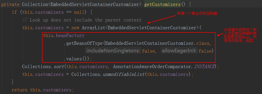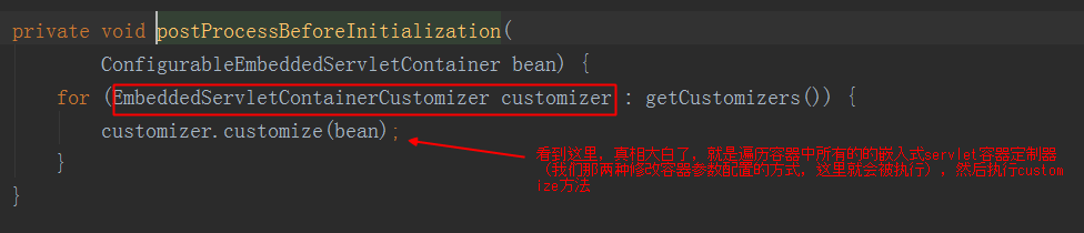 到这里就差不多了,一个很大的循环,和最开始的嵌入式servlet容器定制器链接起来了,哈哈,剖析了清楚了,还是很容易的,而且,上图中我们还可以看看getCustomizers()是怎么获取所有的定制器的,点开这个方法