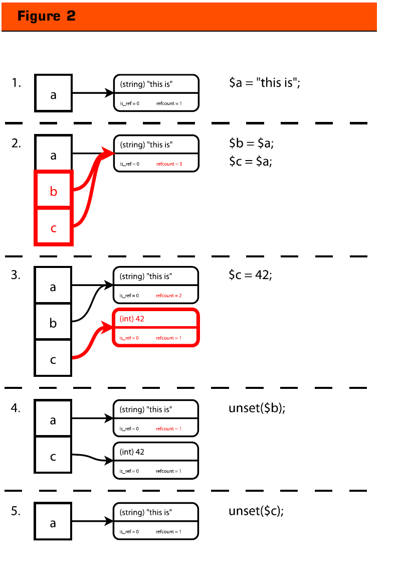现在,也许你很想知道当变量$c改变时将发生什么。根据refcount的值的不同,它会有两种不同的处理方式。如果 refcount等于1,这个变量容器将更新它的值(也许同时会更新它的类型)。如果refcount大于1,将创建一个包含了新值(和类型)的变量容 器。如图2所示的第三步,$a变量所在的变量容器的refcount值被减去一,现在refcount的值是2,而新创建的容器的refcount的值为 1。当对一个变量使用unset函数时,这个变量所在的容器的refcount值将减去一,如图第4步所示。如果refcount的值少于1,Zend引 擎将翻译这个变量容器,如图第5步所示。