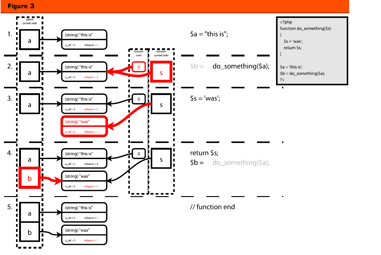 第四步,我们通过return语句返回一个变量。返回的变量从全局符号表中获取一个实体并将其refcount的值增加1.当函数结束时,函数的符 号表将被销毁。在销毁的过程中,Zend引擎将遍历符号表中的每个变量,并将其refcount的值减少。当变量容器的refount的值变为0,这个变 量容器将会被销毁。如你所见,由于 PHP的引用计数机制,变量容器不是以拷贝的方式从函数返回。如果变量$s在第三步时没有被修改,则变量$a和$b将一直指向相同的变量容器(这个容器的 refcount为2)。在这种情况下,语句$a = “this is”将不会创建变量容器的副本。