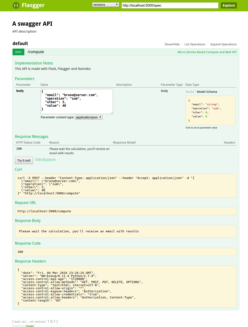 app = Flask(__name__) Swagger(app) CONFIG = {'AMQP_URI': "amqp://guest:guest@localhost"}