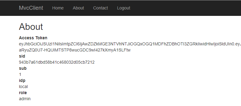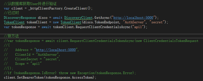 TokenClient tokenClient = new TokenClient(disco.TokenEndpoint, "AuthServer", "secret"); var tokenResponse = await tokenClient.RequestClientCredentialsAsync("api1"); //var tokenResponse = await client.RequestClientCredentialsTokenAsync(new ClientCredentialsTokenRequest //{ // Address = "http://localhost:5000", // ClientId = "AuthServer", // ClientSecret = "secret", // Scope = "api1" //}); //if (TokenResponse.IsError) throw new Exception(TokenResponse.Error); client.SetBearerToken(tokenResponse.AccessToken); //根据User_Id获取user