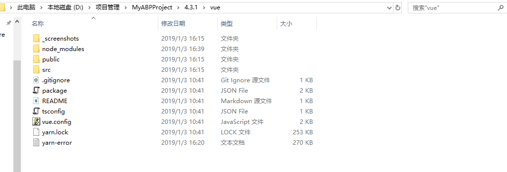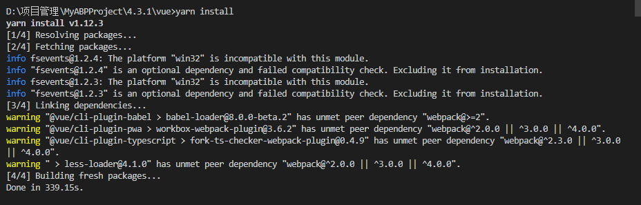 在终端中打开vue项目的目录地址(D:\项目管理\MyABPProject\4.3.1\vue>),通过命令“yarn install”进行安装项目依赖,恢复安装完成后如下图显示: