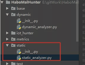 在哈勃沙箱的代码目录中,static目录下即为静态检测的代码,代码很清晰。静态检测的本质是特征码匹配,对已知的恶意文件进行快速匹配进而查杀,如果能在静态检测层面发现恶意代码,就不需要动态分析了,这样速度就会快很多。