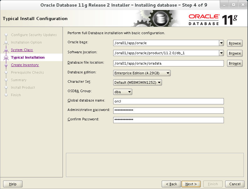 然后你输入安装 Oracle 11g 的各种路径以及密码。下面是我自己的 Oracle 11g 安装配置。确保你正确输入了 Oracle 的密码。