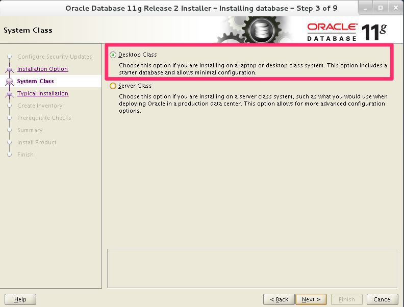 然后我选择安装 Oracle 11g “Decktop Class”。如果是生产环境,你必须选择 “Server Class”。