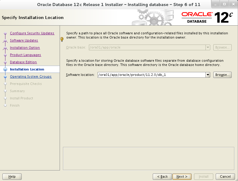 在第二步,你会发现它显示了 11g 的位置路径以及 12c 的位置路径。同时你也会发现它指示说从原来的 Oracle Home Release 11 安装 Oracle Home Release 12.点击下一步进入步骤三。
