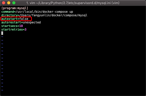 [program:mysql]command=/usr/local/bin/docker-compose up directory=/Users/fangyunlin/docker/compose/mysql autostart=true autorestart=unexpected startsecs=10startretries=3