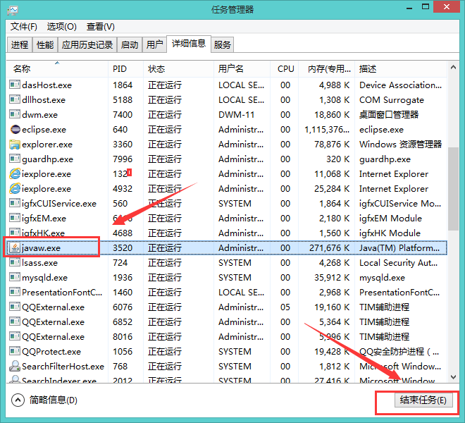 一、打开项目管理器,找到javaw.exe,点击结束进程,再重启就OK了。