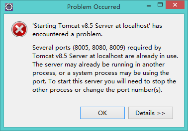 Several ports (8005, 8080, 8009) required by Tomcat v8.5 Server at localhost are already in use.