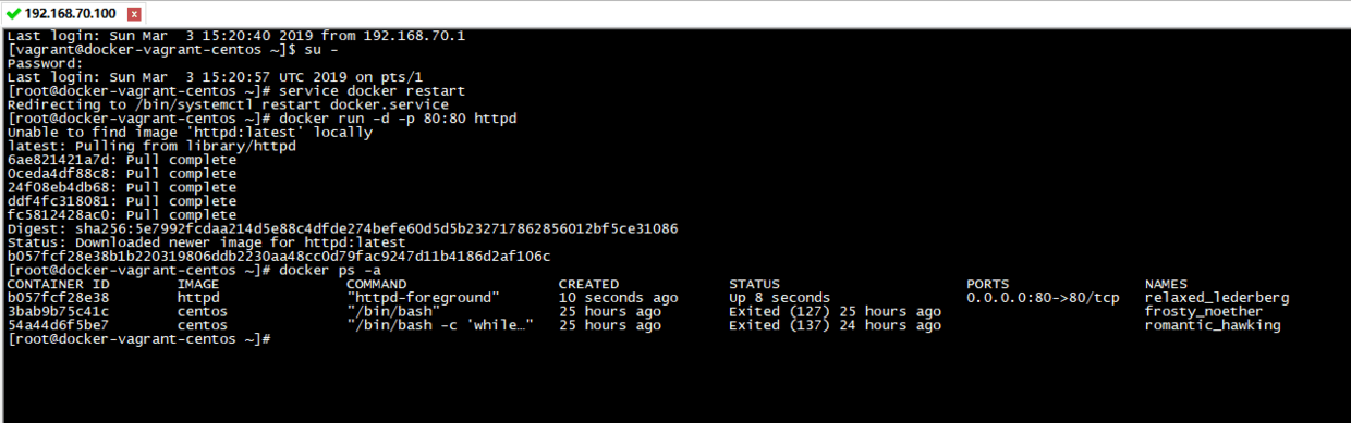 su - #密码vagrant service docker restart #后台启动一个容器httpd,容器内部端口80,映射到外部是80 docker run -d -p 80:80 httpd