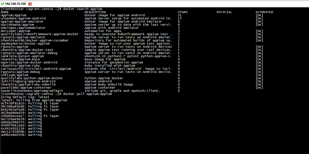 docker search appium #比较大1个多g,因为之前已经设置了加速器,根据自身的网速来进行下载。 docker pull appium/appium