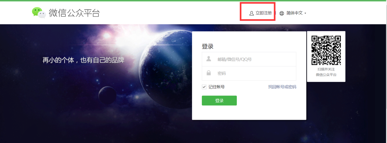 打开网址:在微信公众平台官网首页(mp.weixin.qq.com)点击右上角的“立即注册”按钮