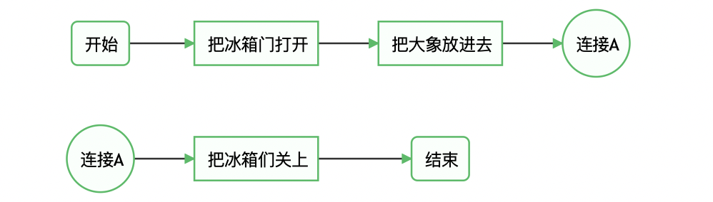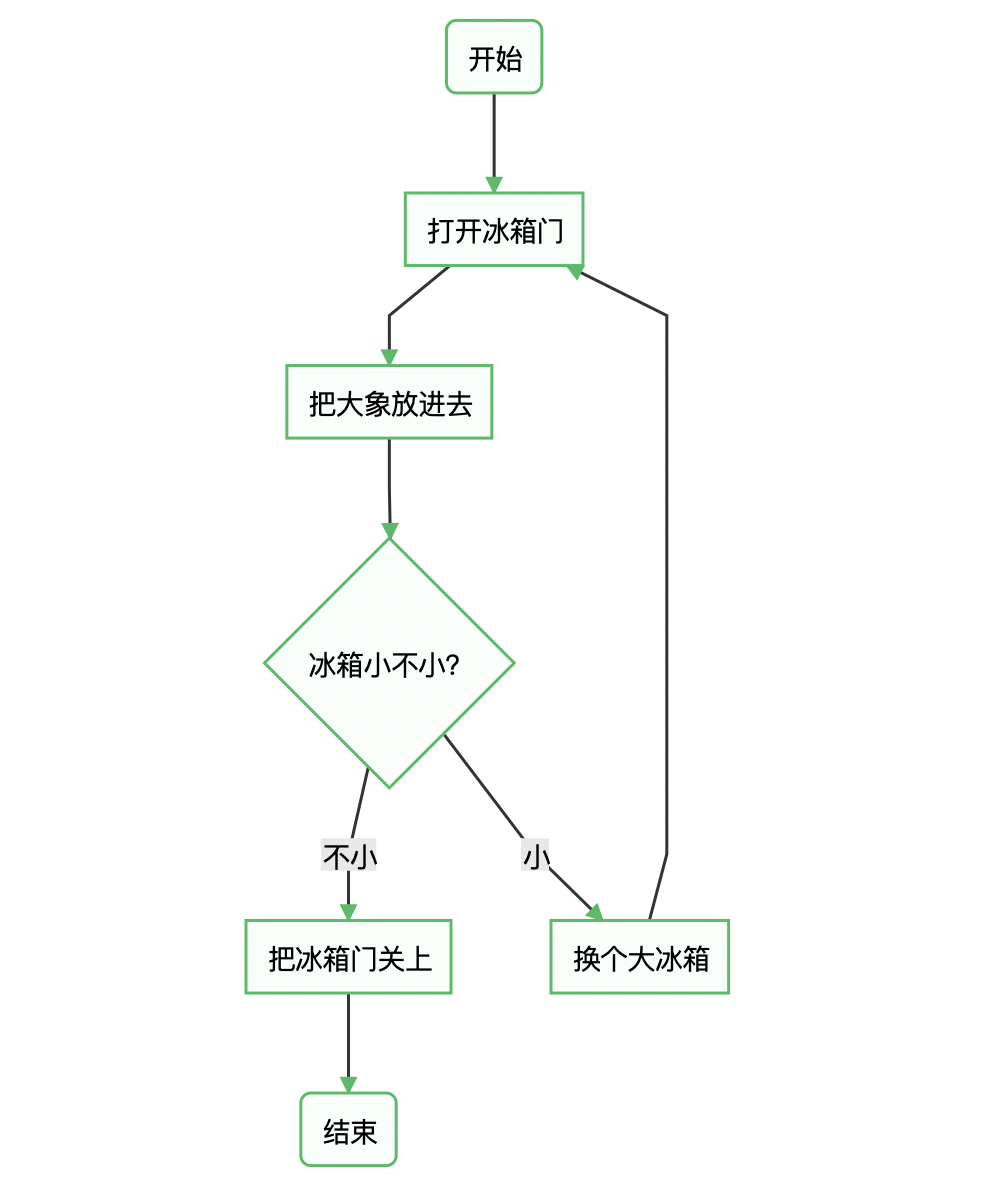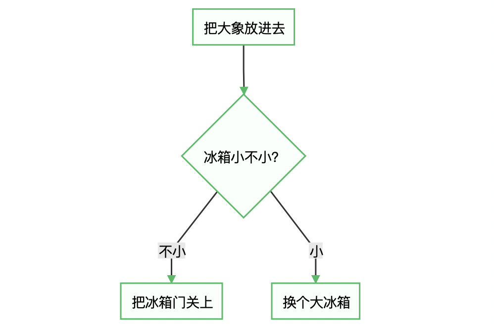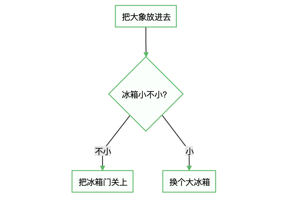 Put[把大象放进去] --> IsFit{"冰箱小不小?"}