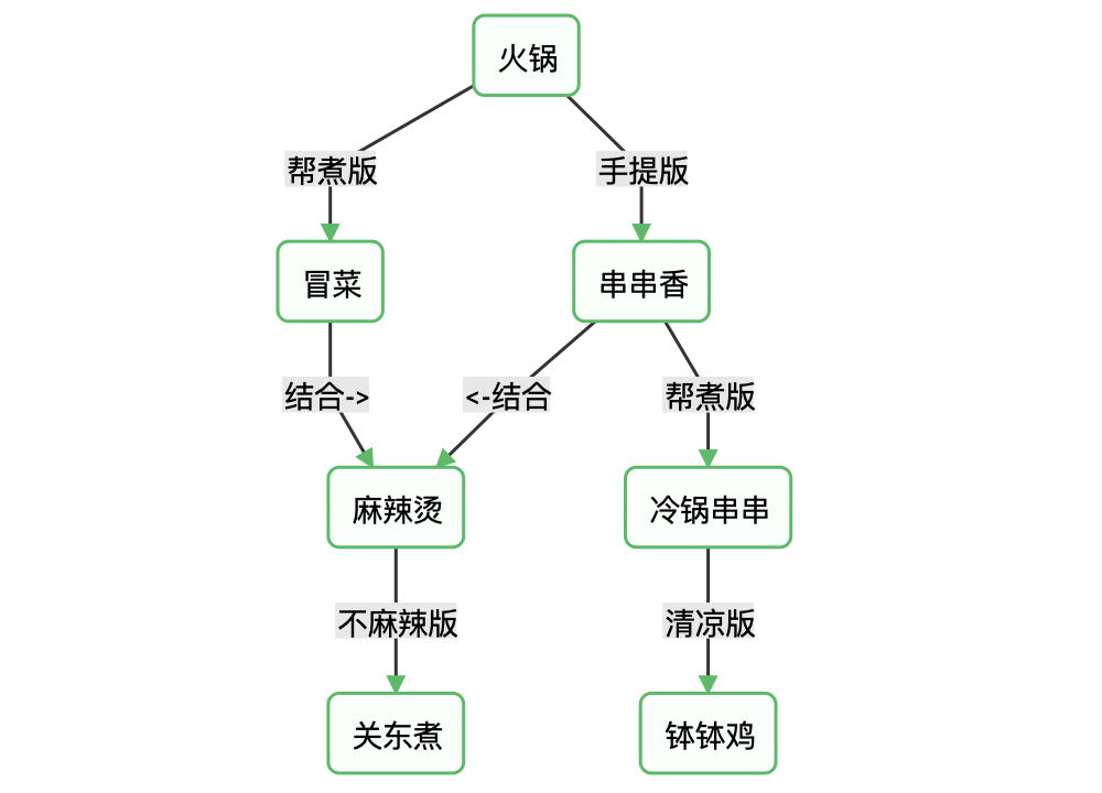 当然,节点和线段的表现力可以很丰富,不仅限于用于流程图,你也可以借助它们来表现其它内容。如下面是火锅冒菜麻辣烫的关系图!