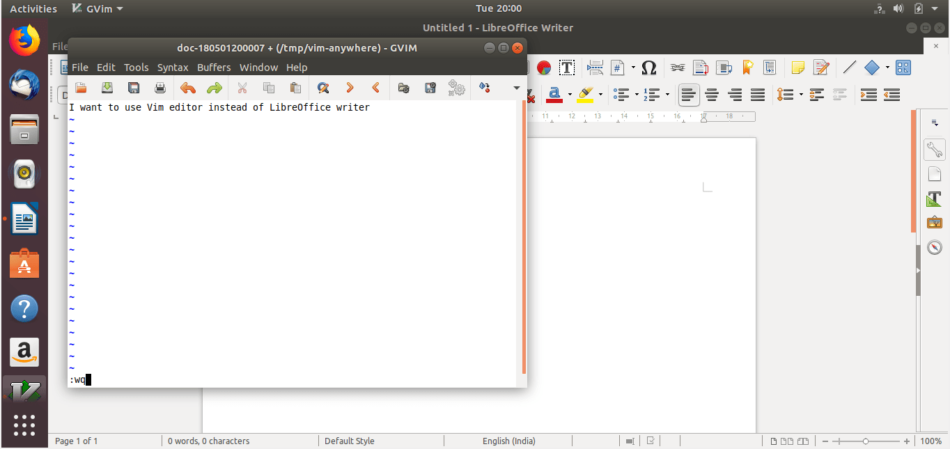 假如你需要创建一个 word 文档。但是你更愿意使用 Vim 编辑器,而不是 LibreOffice。没问题,这里 Vim-anywhere 就派上用场了。Vim-anywhere 自动化了整个流程。它仅仅简单地调用 Vim 编辑器,所以你能写任何你所想的,然后将之粘贴到 .doc 文件中。