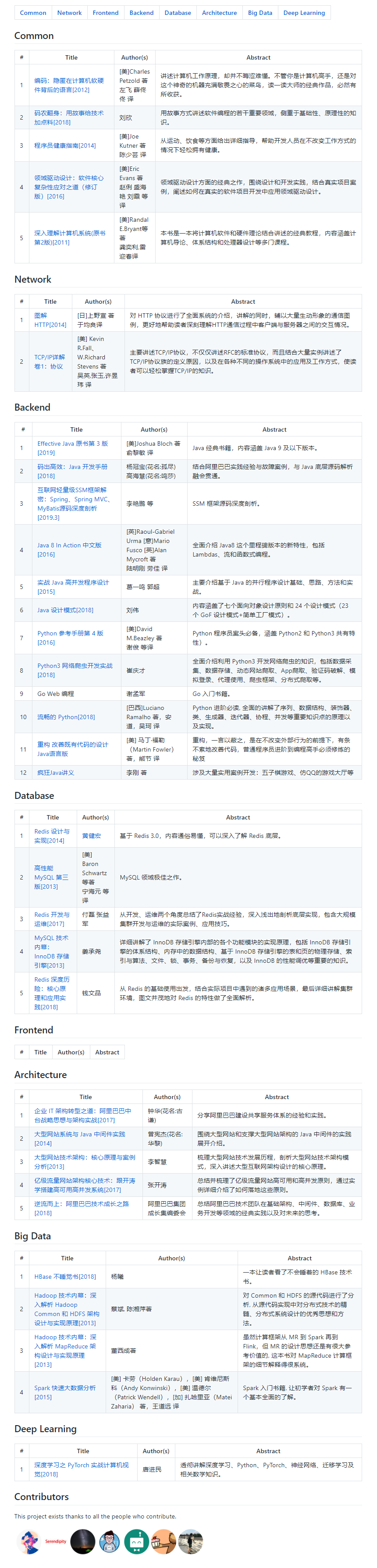 关于书籍,我推荐这一份“值得一看的技术书籍列表”。GitHub:https://github.com/doocs/technical-books