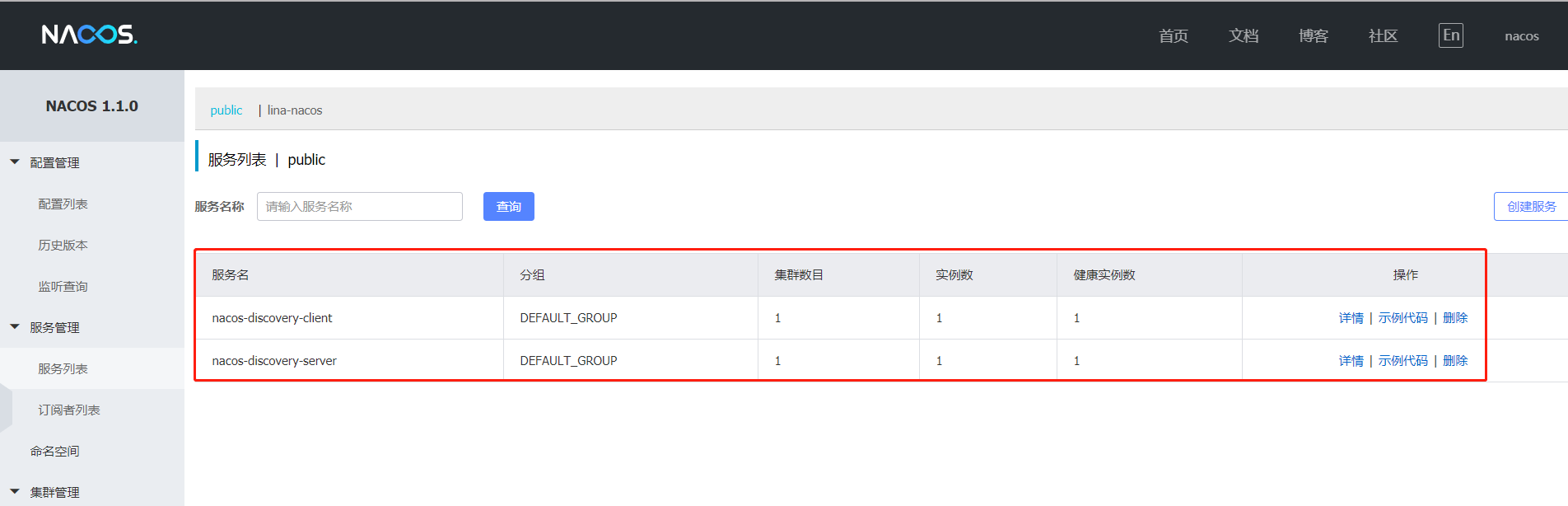 分别启动 feign-server 和 feign-client,然后登录Nacos控制台,如果出现以下两个服务说明配置成功。
