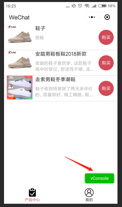 重新进入小程序,可以看到页面数据已经出来了,并且右下角有个绿色方形的调试工具按钮