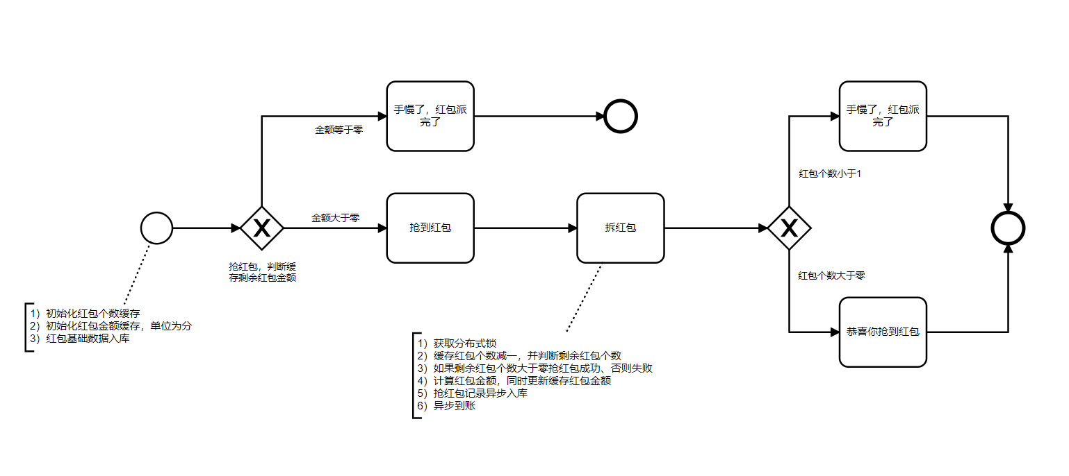 redPacketId获取分布式锁,如果获取到锁,红包个数减一,如果剩余红包个数大于零抢红包成功、否则失败。成功则计算红包金额,缓存总红包金额减去抢到的红包金额,异步入库、异步到账。