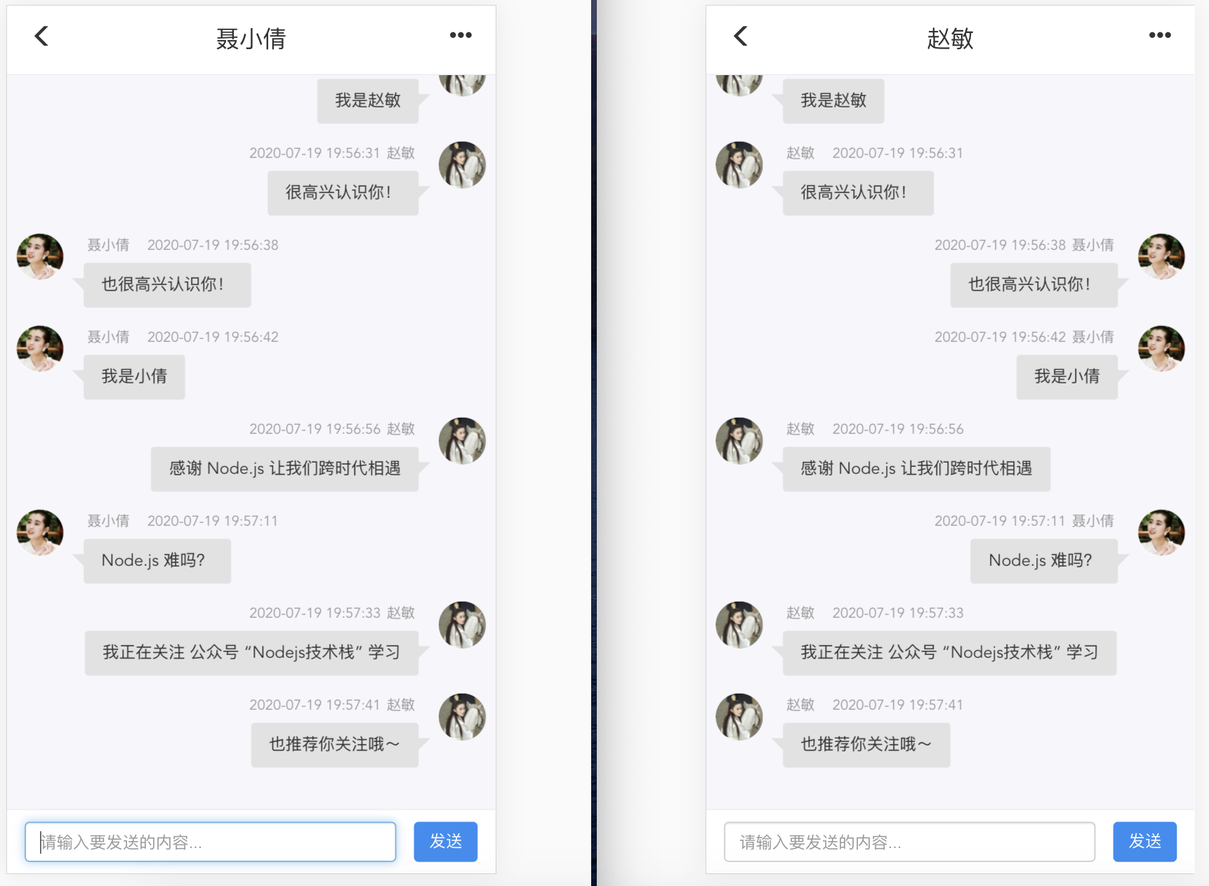 在客户端发送消息,则是监听发送按钮的 onclick 事件或回车事件,对消息做一些处理通过 socket.emit 发送到服务端,由服务端转接到另一客户端。