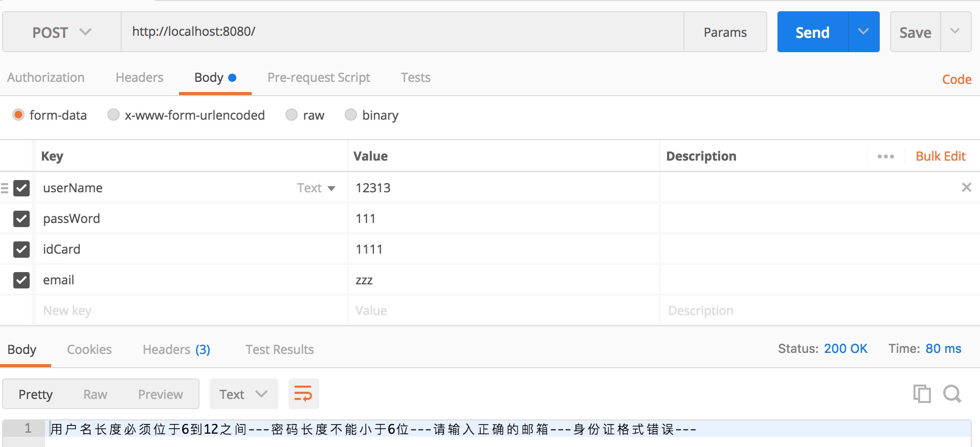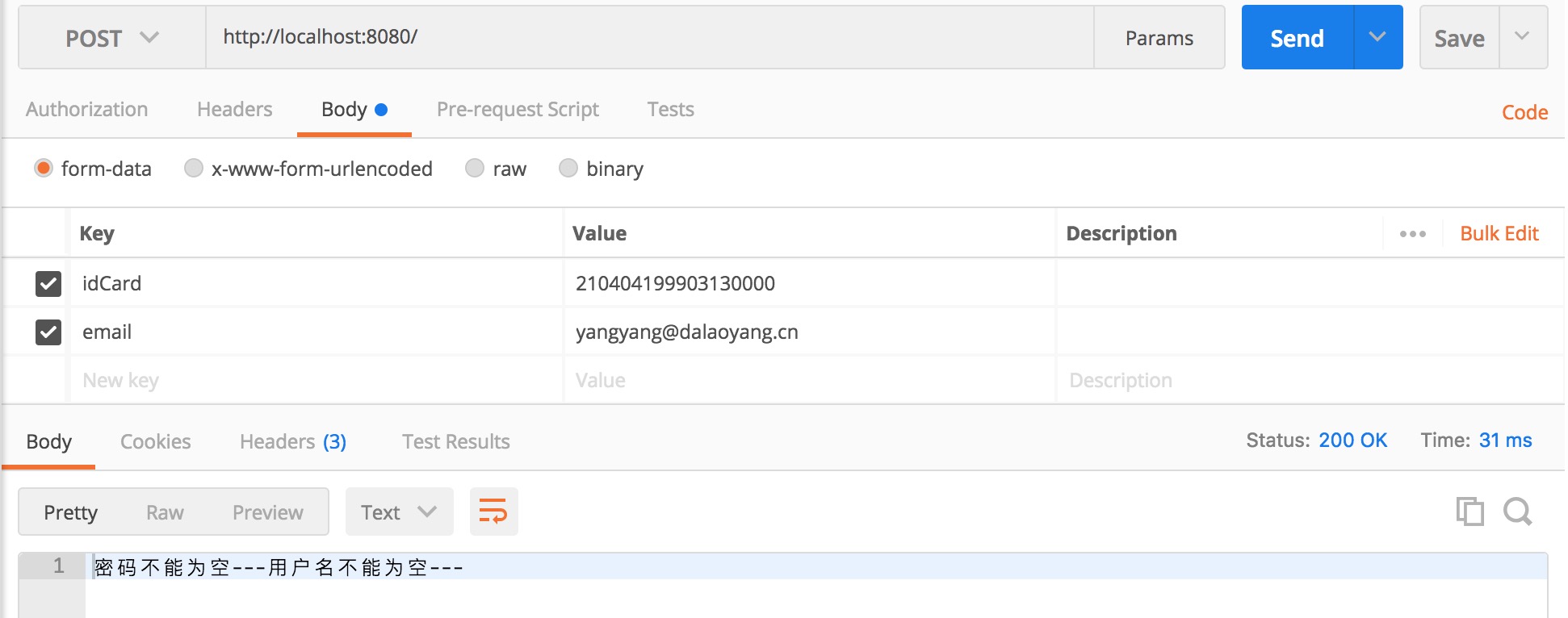 在前台表单验证的时候,通常会校验一些数据的可行性,比如是否为空,长度,身份证,邮箱等等,那么这样是否是安全的呢,答案是否定的。因为也可以通过模拟前台请求等工具来直接提交到后台,比如postman这样的工具,那么遇到这样的问题怎么办呢,我们可以在后台也做相应的校验。