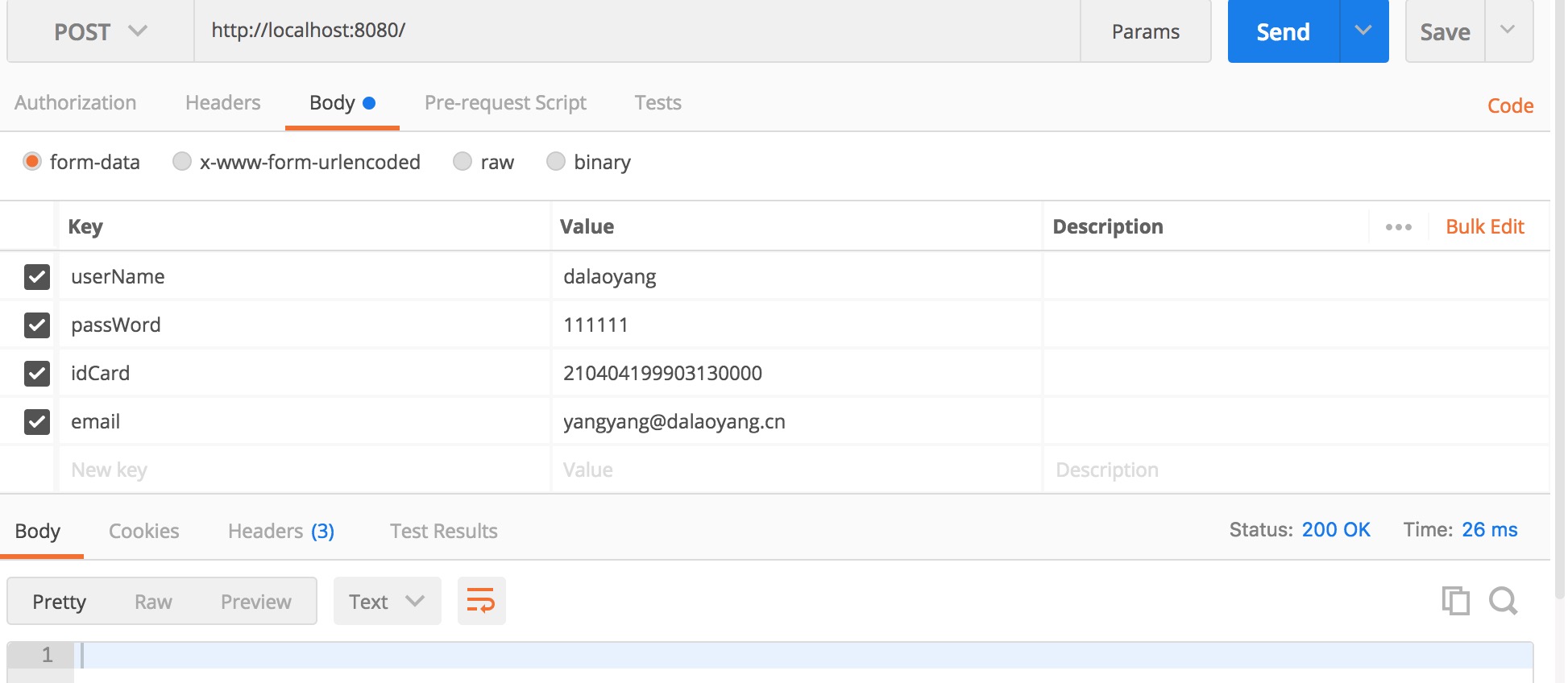 }启动项目使用postman分别做了三次请求,第一次所有属性都是随便填写的,如图