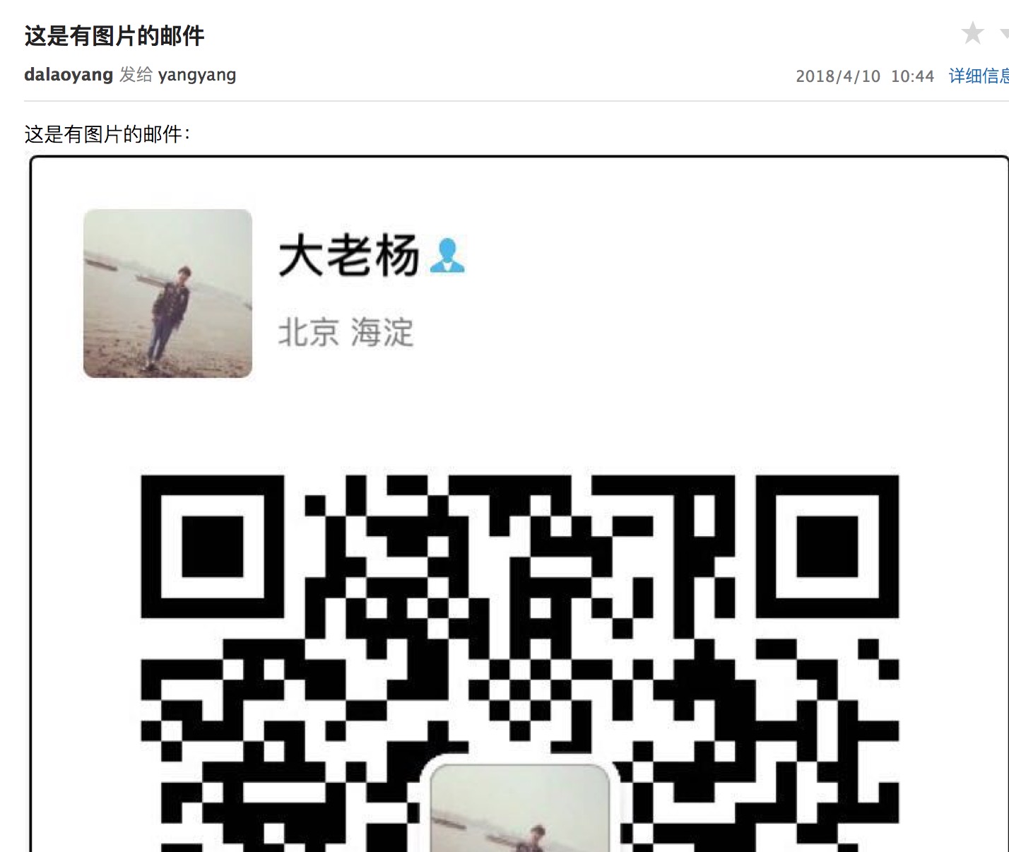 }访问http://localhost:8888/sendInlineResourceMail,可以看到页面上显示success,在去看邮箱可以看到如下图,证明发送成功
