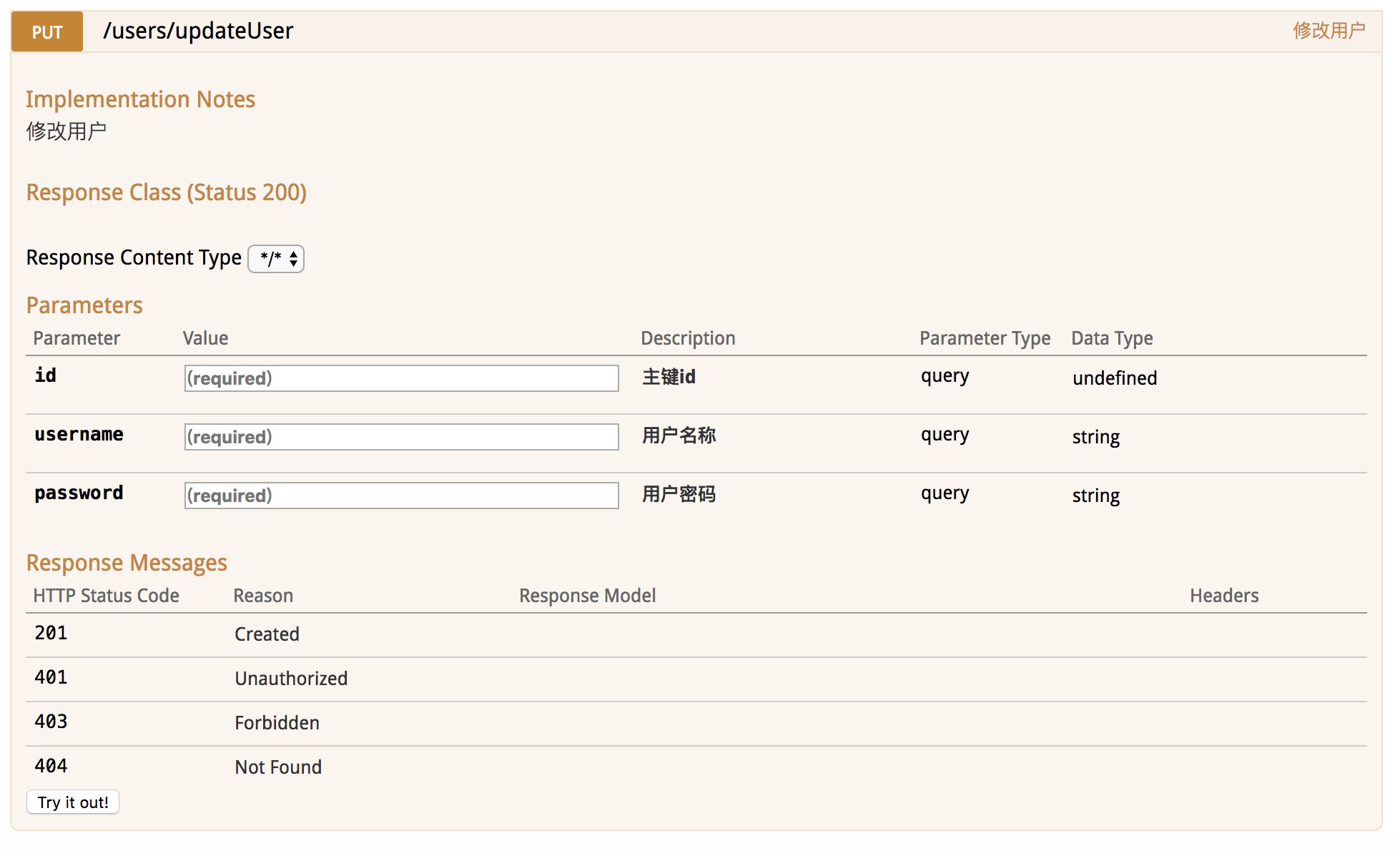 @ApiImplicitParam(name="username",value="用户名称",required=true,paramType="query",dataType = "String"),