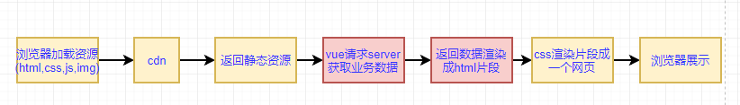 在上面两个流程中,咱们可以看到,普通的客户端渲染,和SSR 的服务端渲染的最大区别就在于,Html 片段到底被谁控制,是 Vue 还是服务端,如果是前端,h5请求 API 的时候,因为涉及到跨域,本身除了服务器的限制,还有用户网络,宽带等诸多限制,咱们需要等待入口页面和 JS 下载成功,才能根据逻辑去获取数据,中间又会出现很多问题。