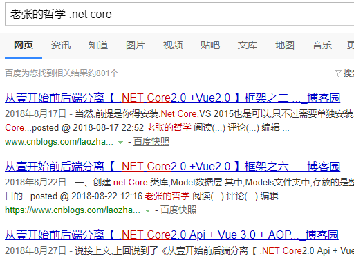 转眼过去一段时间,接触的也越来越多,这个时候我负责了一个旅游游记的项目,老板说,我们的数据才千级别,比较少,用户搜索咱们的不是很方便,让我搞些网上的数据(当然是合法的哈,只是用来展示,划重点),这个时候我才知道了竟然有 爬虫 这个东西!原来网上的资源可以随心所欲的获取(合法的 × 3 !),这个时候回头看引擎,哦!原来他们的都是爬取的网上的信息,举个栗子:大家可以在百度上搜索 “老张的哲学 .net core”,会看到咱们的文章,可以看到不仅有题目,还有文章正文,这也就是说,百度爬取的不仅仅是咱们的 TDK ,还有咱们的文章内容,大概这就是我认识的搜索 3.0 了。