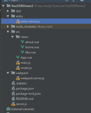 ├── dist // 保存我们的打包后的文件 ├── node_modules // 依赖包文件夹 ├── entry // │ └── entry-server.js // 服务端文件 ├── src // 我们的项目的源码编写文件 │ ├── views // view存放目录 │ │ ├── about.vue //about 页面 │ │ ├── like.vue //like 页面 │ │ └── Home.vue //Home 页面 │ └── App.vue // App入口文件 │ └── main.js // 主配置文件 │ └── router.js // 路由配置文件 └── .babelrc // babel 配置文件 └── package.json // 项目依赖包配置文件 └── package-lock.json // npm5 新增文件,优化性能 └── server.js // server 文件 └── README.md // 说明文档