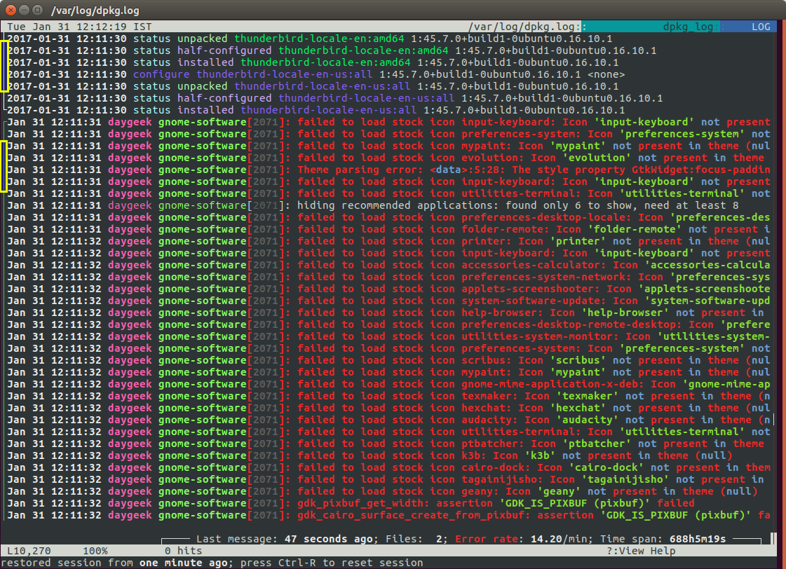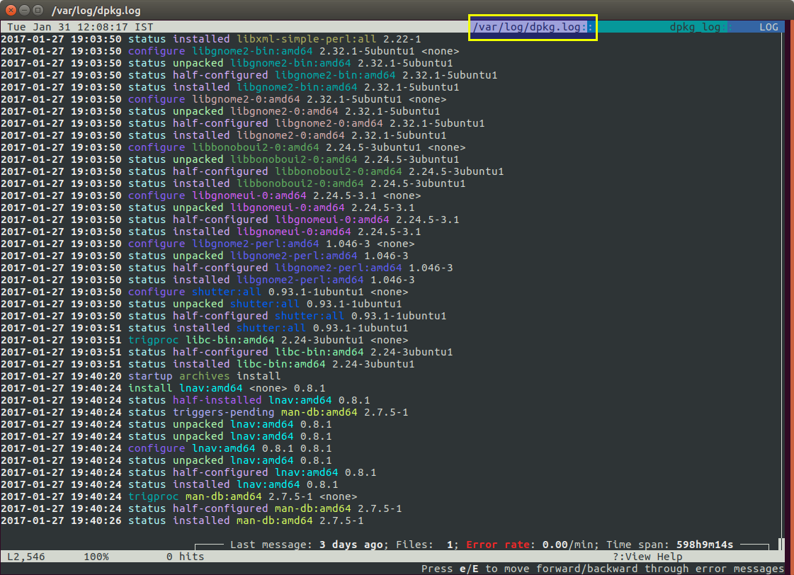 lnav使用不同的方式(它基于日期组合在同一个窗口显示多个日志文件)。# lnav /var/log/dpkg.log /var/log/kern.log