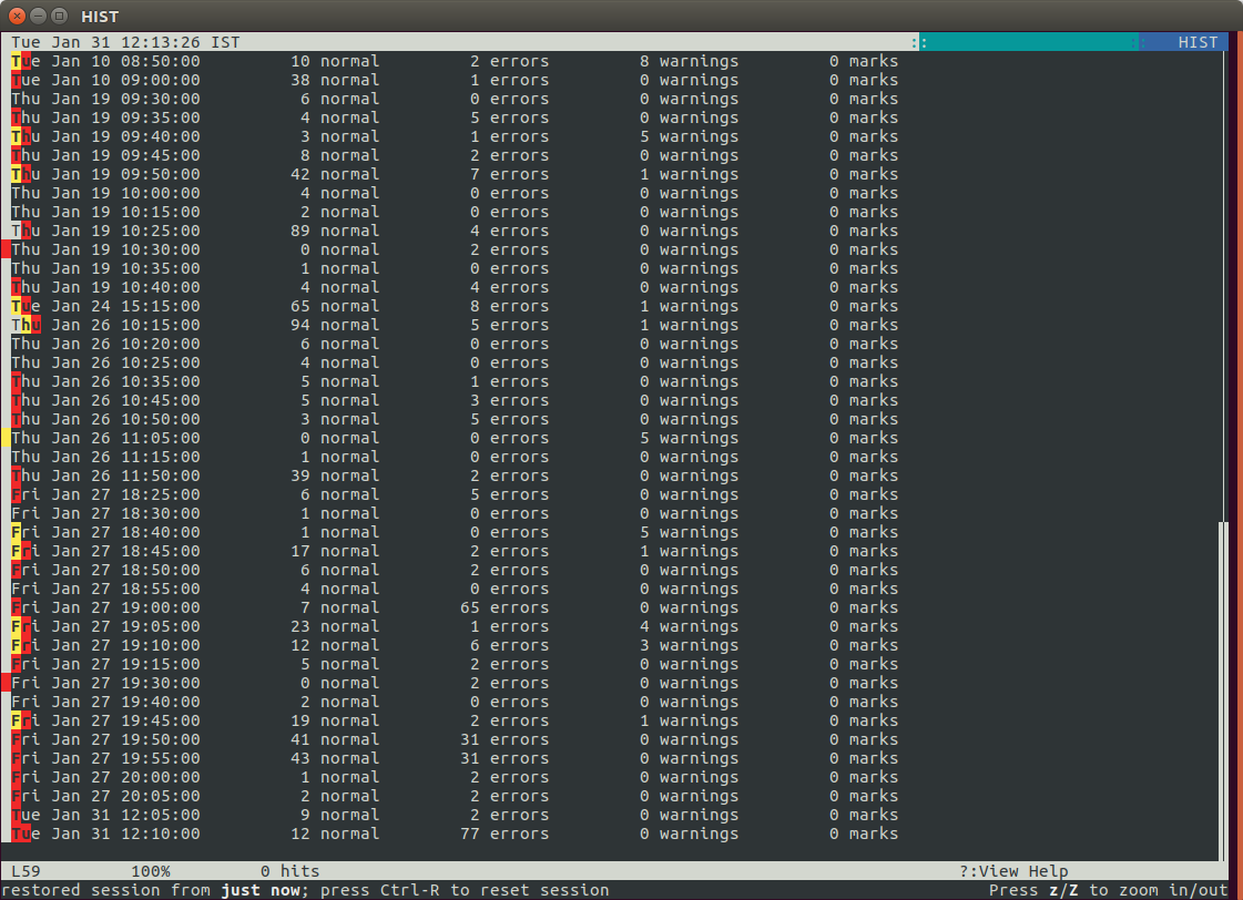 lnav能把多个日志文件合并到一个视图(Single Log Review),从而避免打开多个窗口。左边的颜色栏帮助显示消息所属的文件。警告和错误的数量以(黄色和红色)高亮显示,因此我们能够很轻易地看到问题出现在哪里。它会自动加载新的日志行。