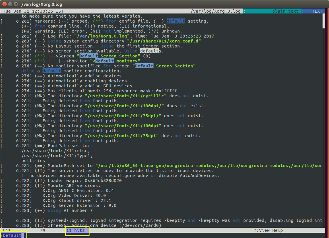 lnav然后按/键并输入你想查找的字符串。为了测试,我搜索字符串Default,看下面的截图。
