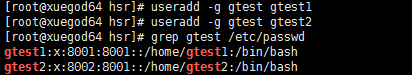 下面使用useradd来创建用户gtest1和gtest2,指定到gtest组8001中,如下图所示: